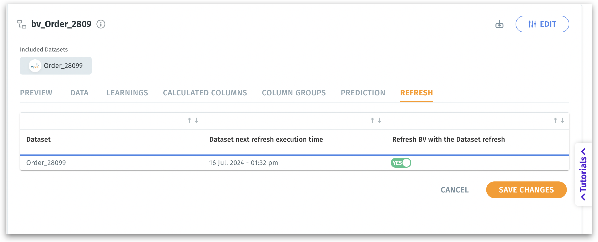 In the above screenshot, the dataset indicates **“No refresh scheduled”**, so Tellius cannot offer a toggle for automatically refreshing the BV. Without a scheduled refresh on the dataset, there is no recurring event to tie the BV refresh to.