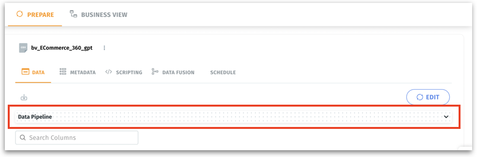 Data pipeline can be found under Data → Prepare → Data and Data → Prepare → Metadata, just above the search bar.