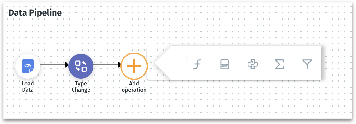 From the Data Pipeline, you can also click on Add Operation (+) button to perform new actions. For more details about the actions displayed, check out this section.