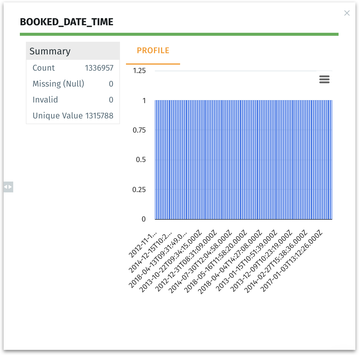 In the above example, each vertical blue bar represents a set of date/time values plotted on an X-axis. The X-axis labels can appear bunched if the dataset is large or if date values are extremely granular. Hovering over may clarify the distribution.