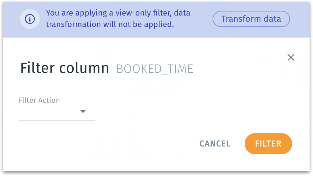 Unlike the view-only filter, applying a filter here alters the dataset in your pipeline or script. Rows that do not meet the condition are permanently removed from the dataset version that’s being prepared.