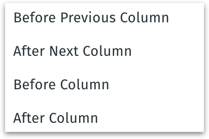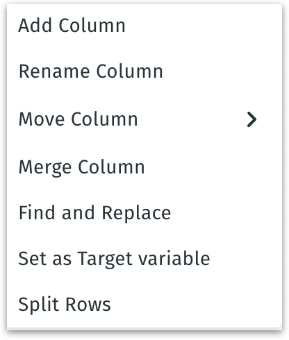 Move Column: Reorder columns in the dataset (e.g., bring an important column to the front). This has sub-options like Before previous column, After next column, Before column, and After column.
