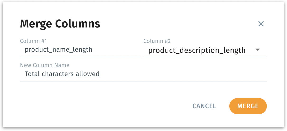 Merge column: Combine two columns into one—often used to concatenate strings (e.g., FirstName + LastName) or unify numeric fields. Here, you specify another column to merge and provide a name to the newly merged column.
