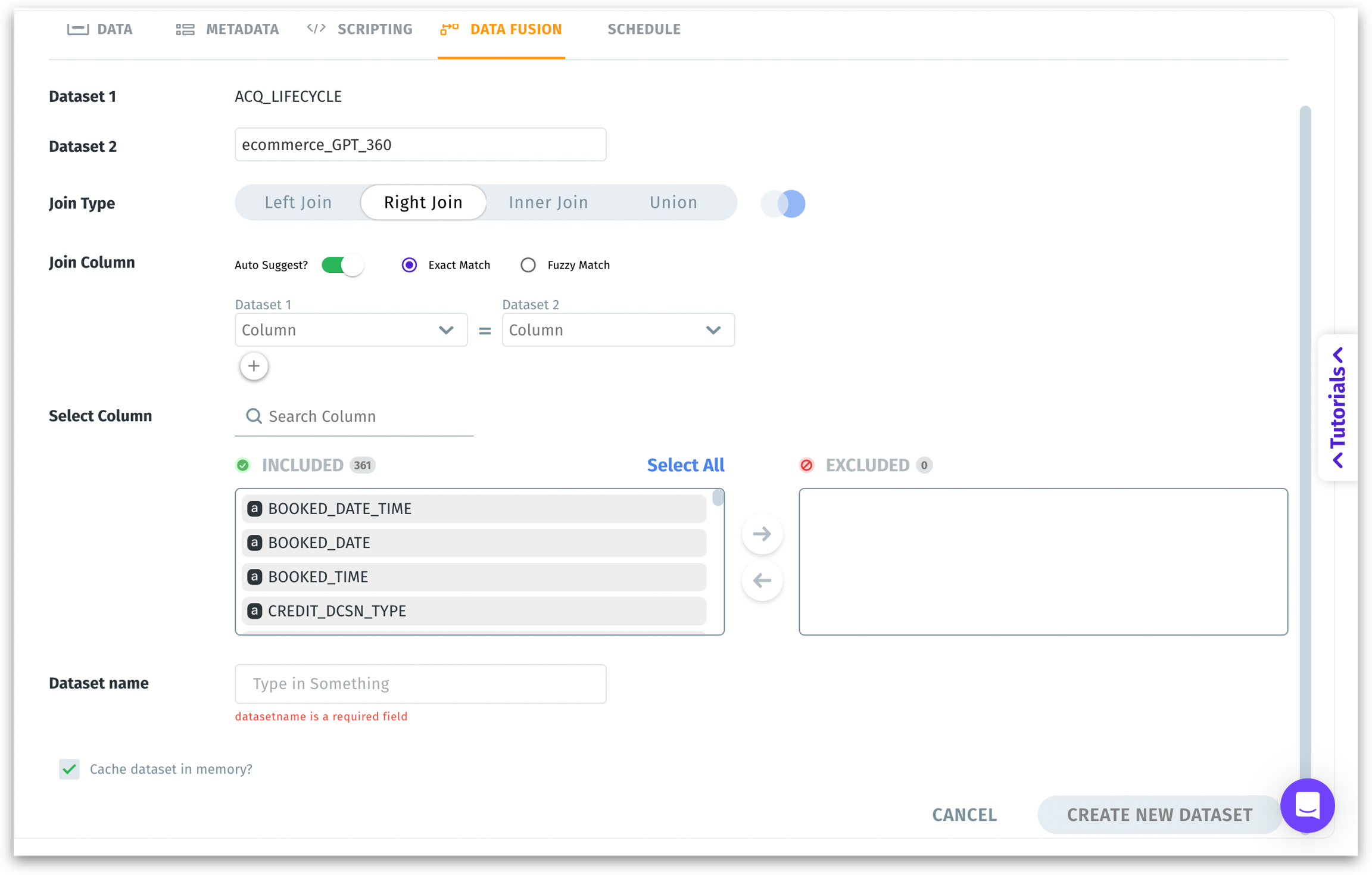 Select Column (Included | Excluded): Choose which columns from both datasets should appear in the final fused dataset. Use the arrows to move columns from Included to Excluded, or vice versa. Search for the required column or choose "Select All" to select all the columns listed.
