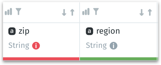 A colored bar (usually, green or red) below the column name indicates the percentage of data found in the column’s recognized data type (e.g., date/time, numeric, or string).