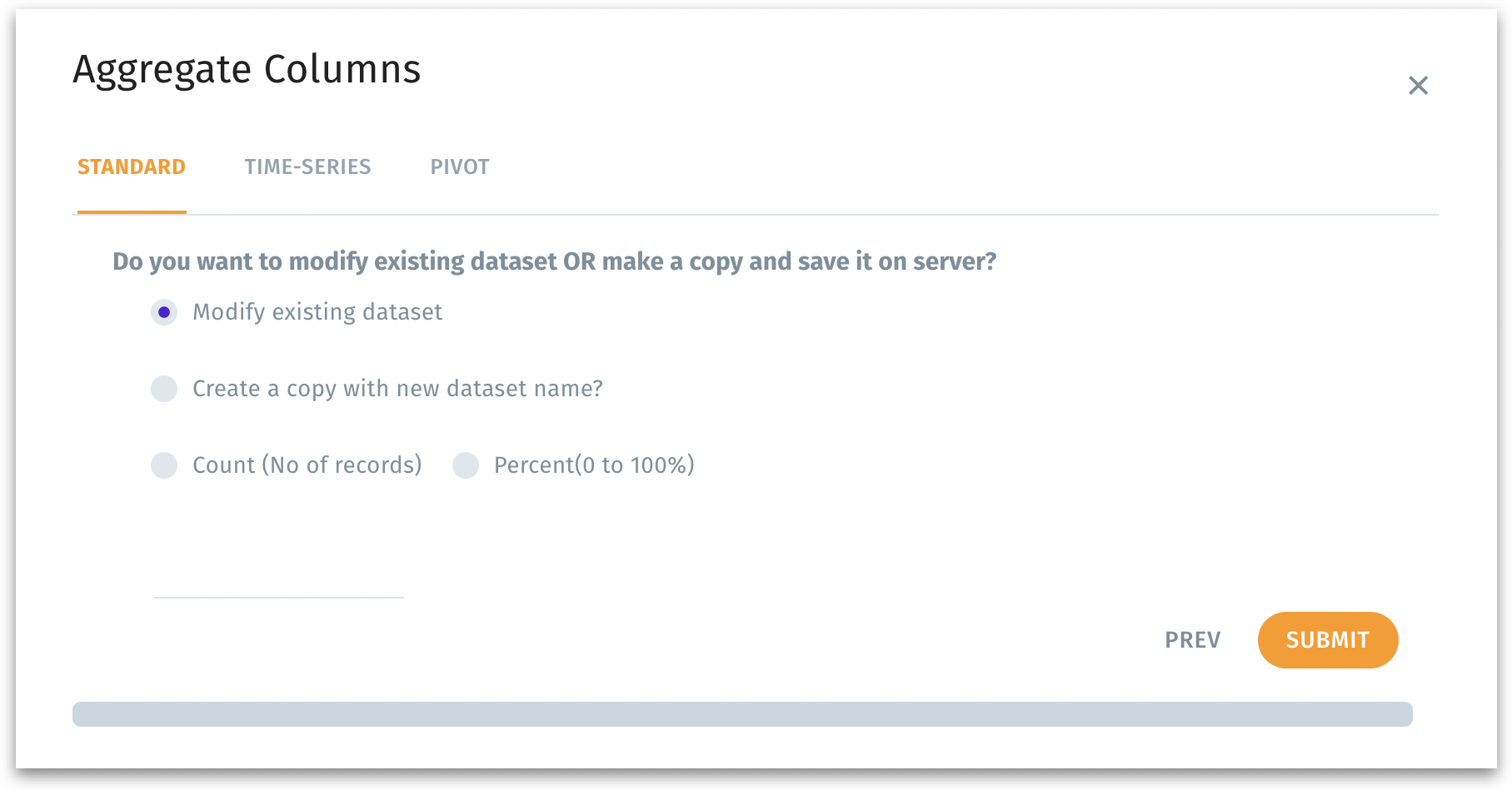 Modify existing dataset: Updates the current dataset directly with the new aggregated columns. Choose this option if you want to overwrite or enhance the existing dataset with the aggregation results.