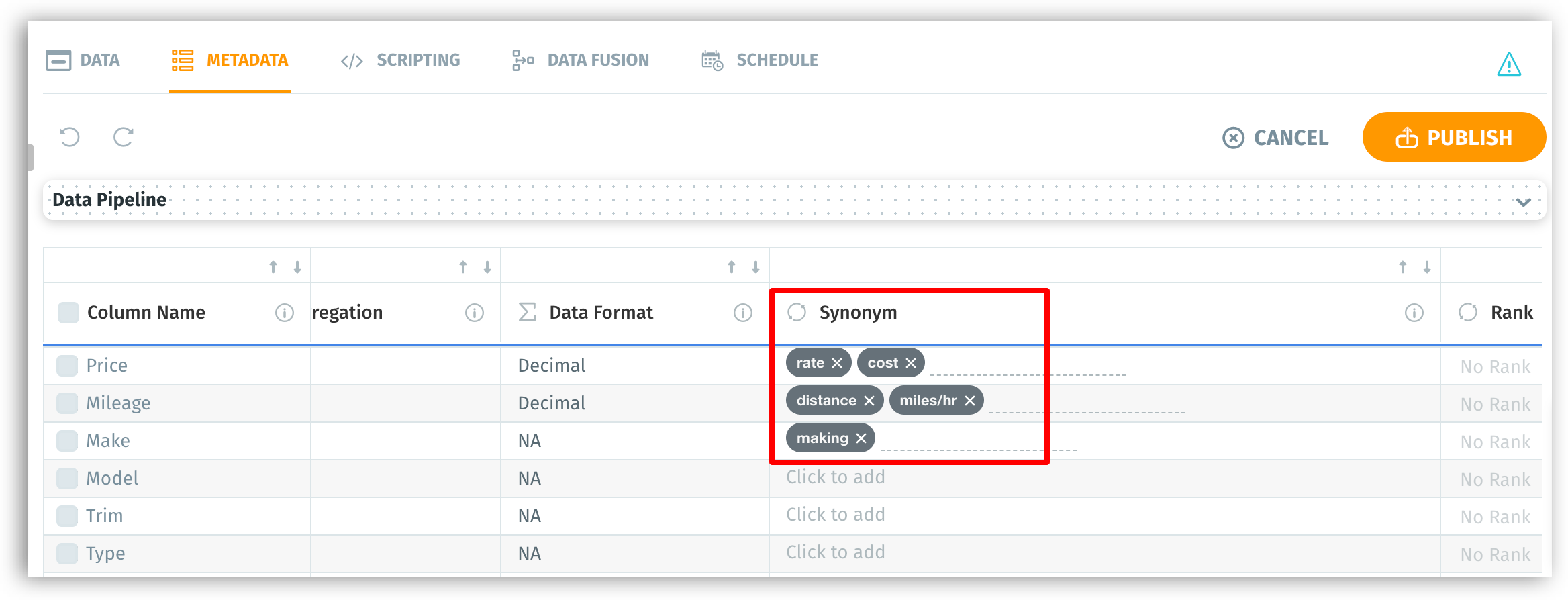 Sometimes, a category could be called using multiple names by different team members. Such additional names could be added under **Synonyms**. They are alternative names that you could provide for a column. Synonyms can be used instead of the actual column name or display name in search queries.