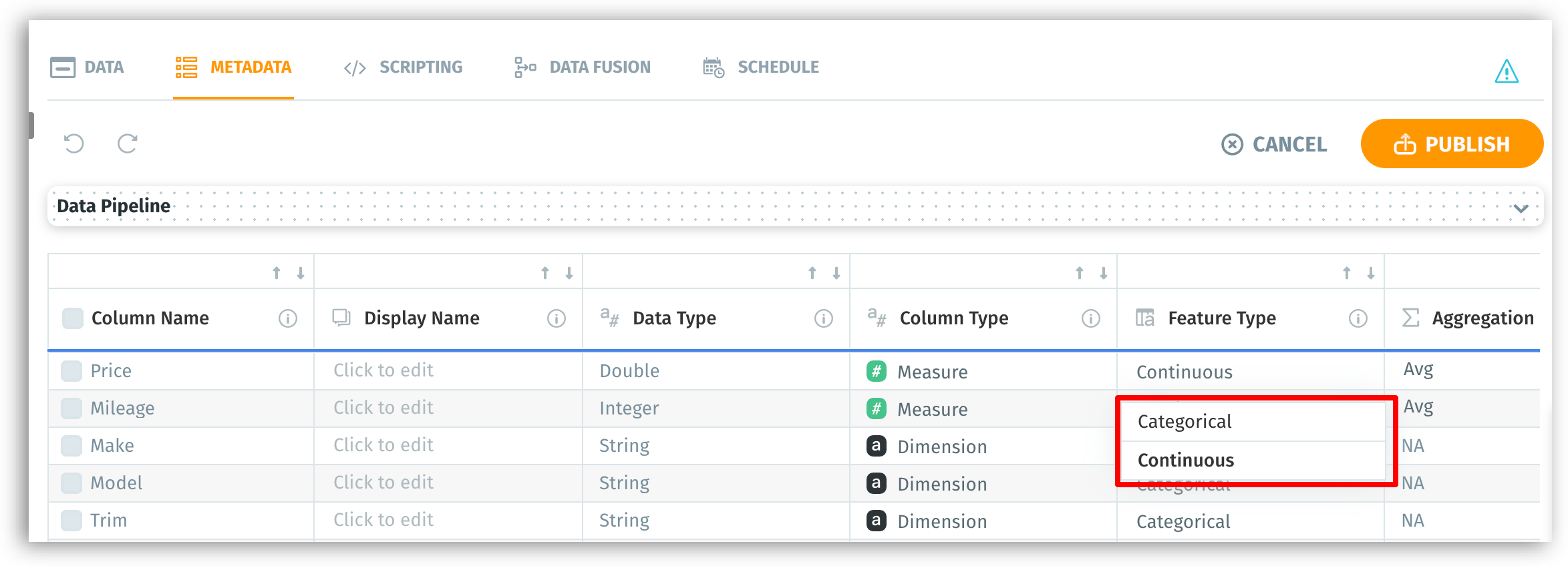Dimensions always have the feature type **Categorical**, while measures can be either continuous or discrete (though in most common use cases, numeric measures will be continuous).