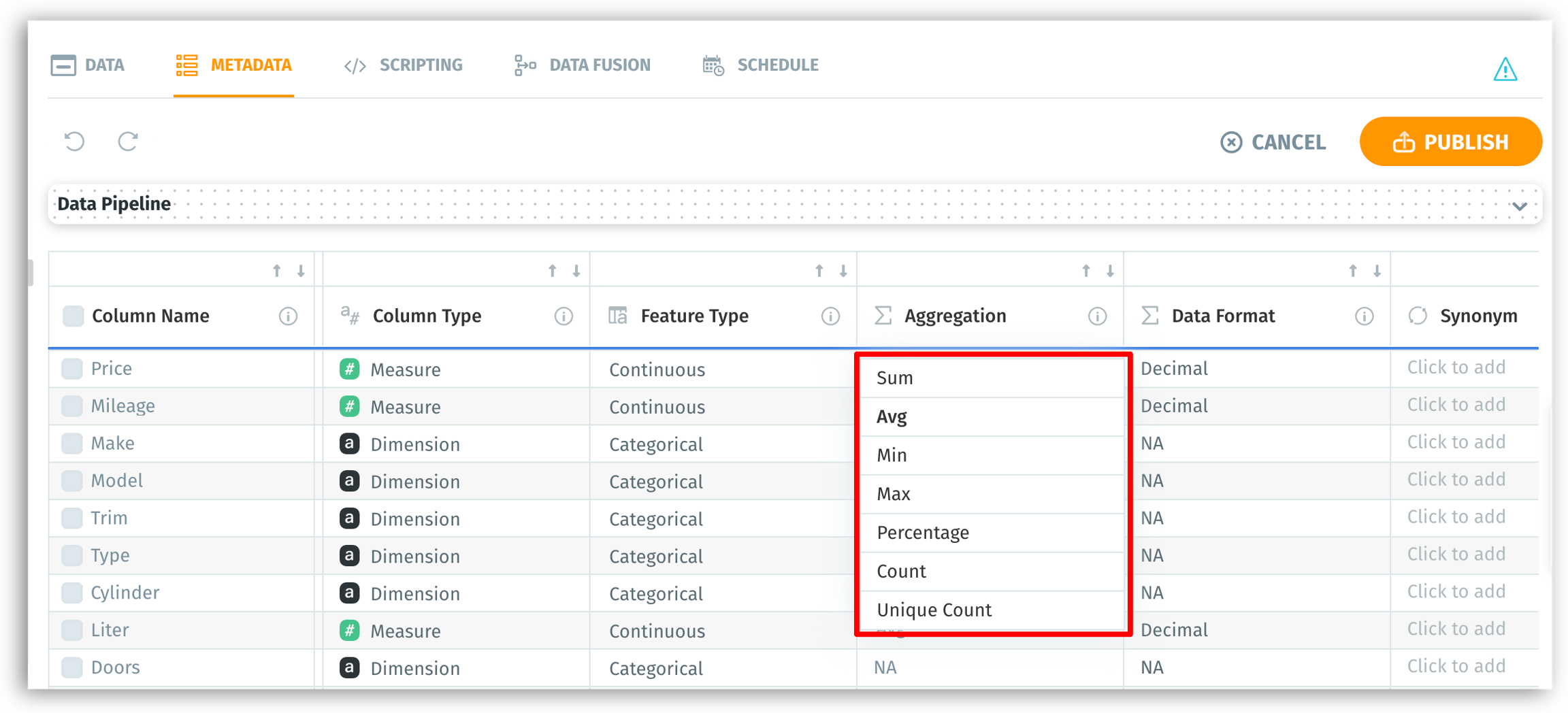 The feature type, data format, and default aggregation of measures can be modified.