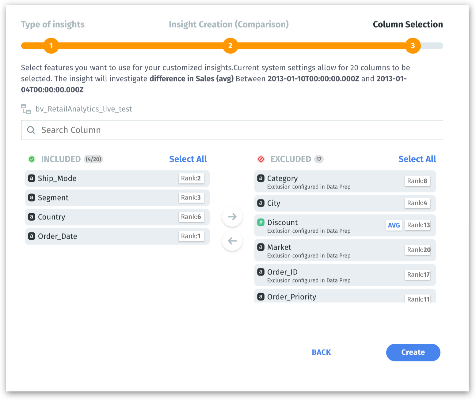While creating Live Insights, the rank of every column will be displayed under Column Selection.