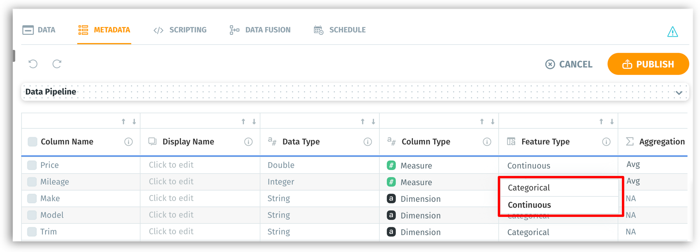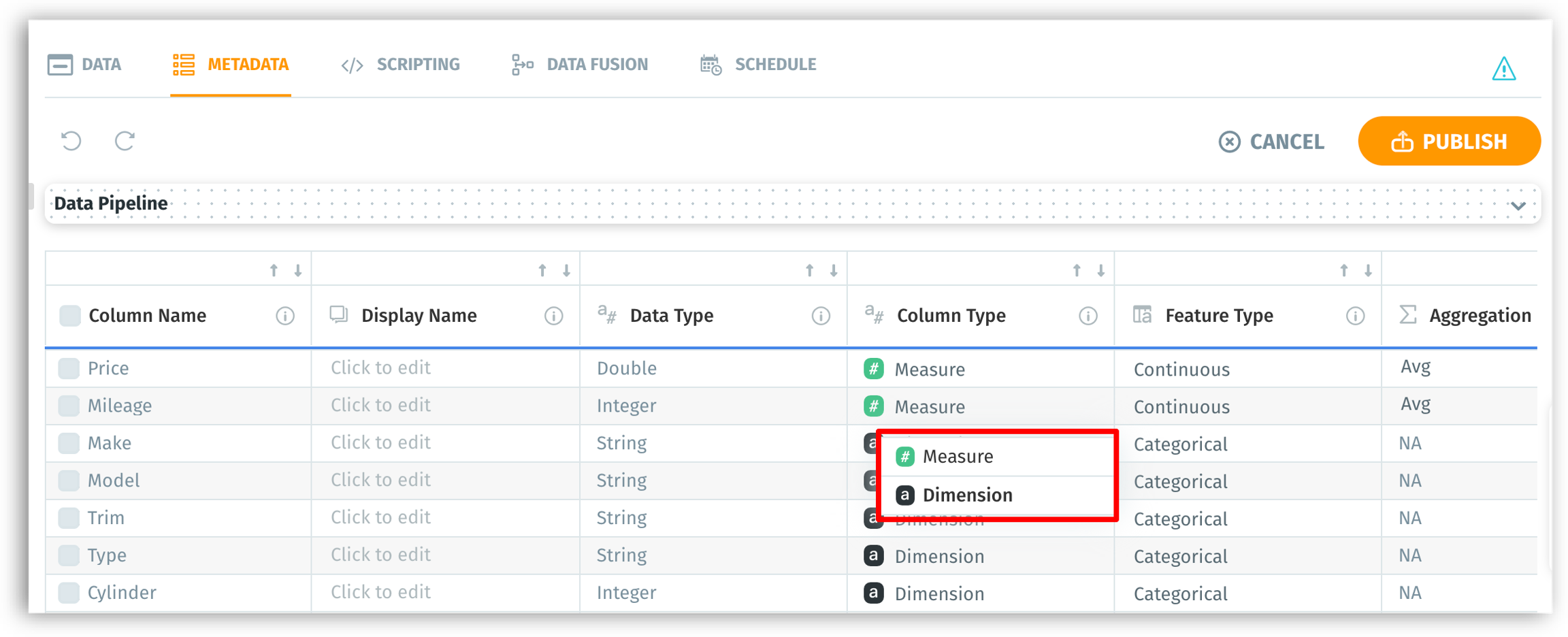 During data preparation, you can inspect and edit the properties of each column, such as: