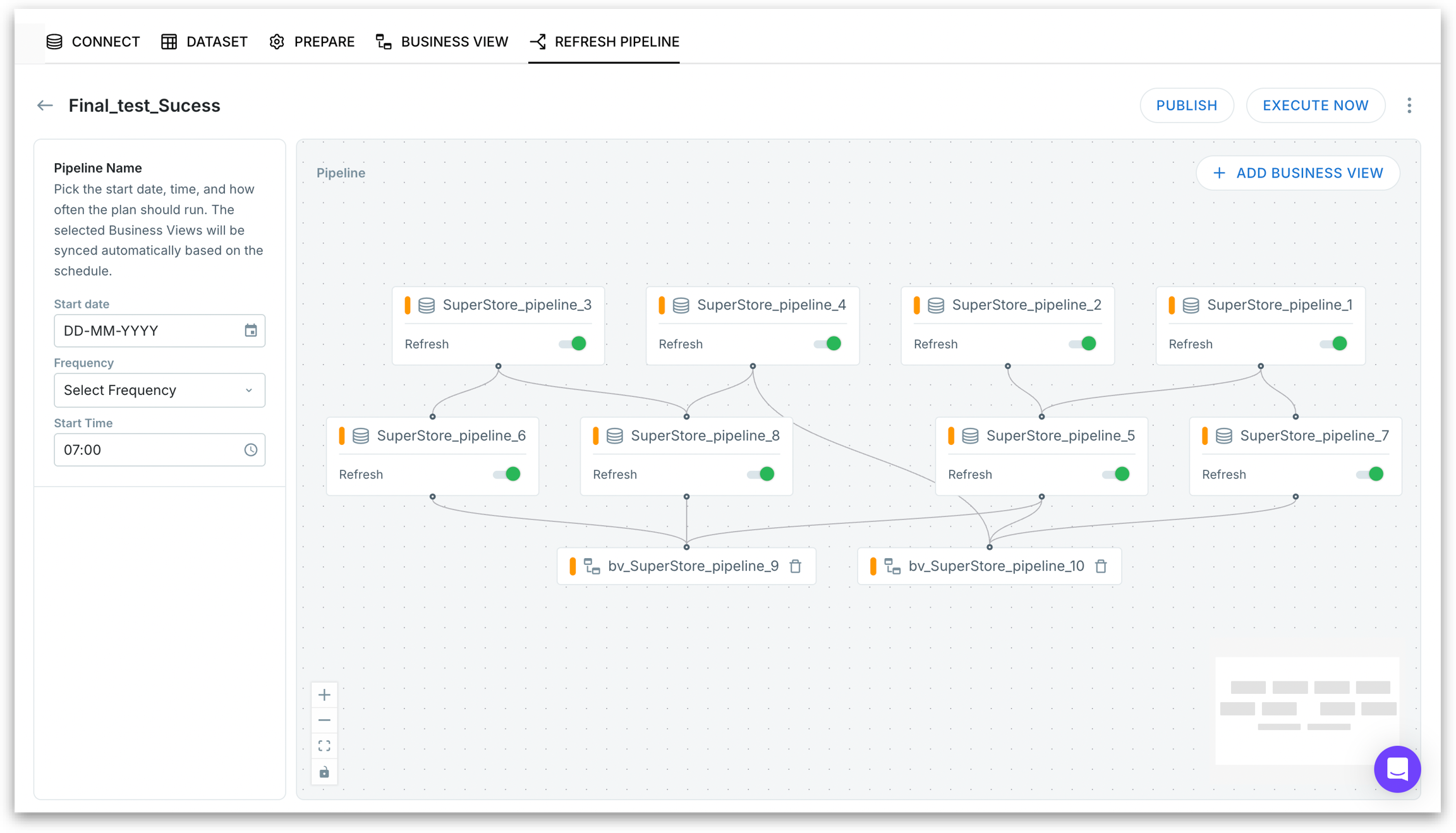 Sometimes, different datasets within a pipeline often have different refresh cadences. That's why Tellius provides node-level toggle control. This allows reuse of the same pipeline for varied refresh schedules without duplication.