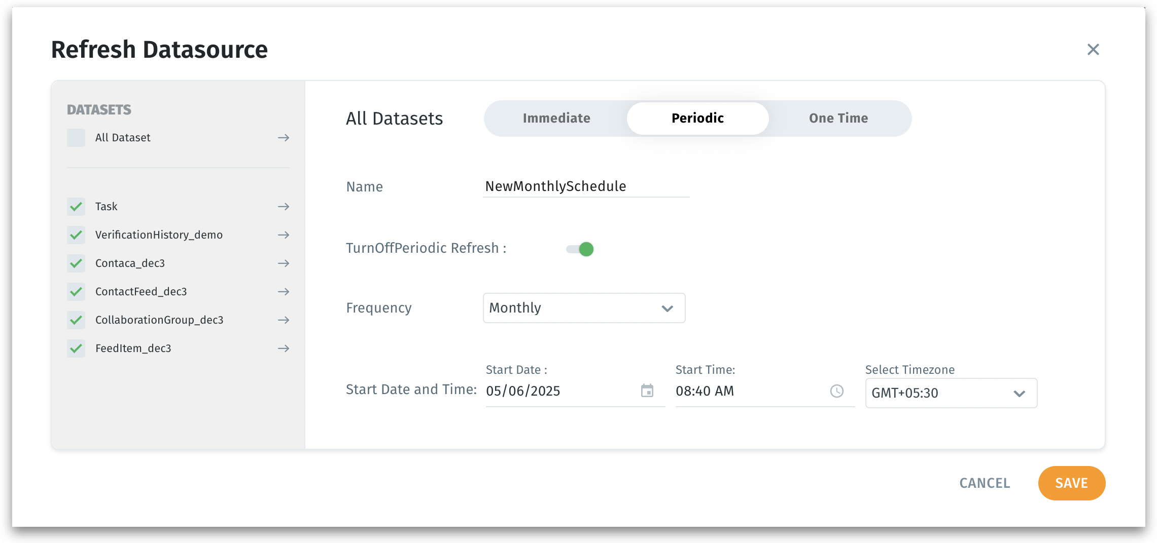 Choose the refresh method from the three available tabs: Immediate, Periodic, One-time.