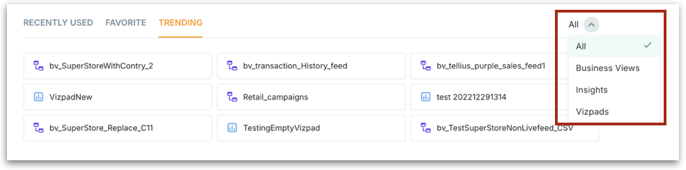 Use this as a launchpad for different artifacts (Vizpads, Insights, Business Views) instead of searching or browsing through multiple modules. These lists auto-refresh based on your activity and organization-wide usage patterns. Each tab can be filtered based on the artifact type.