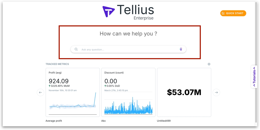 The Tellius Homepage in version 5.4 is redesigned to act as your command center—bringing together critical KPIs, frequently accessed resources, and powerful search capabilities into a single interface. Whether you're a business user tracking daily metrics, or a data analyst jumping between dashboards and datasets, it eliminates unnecessary navigation by surfacing what matters most the moment you log in.