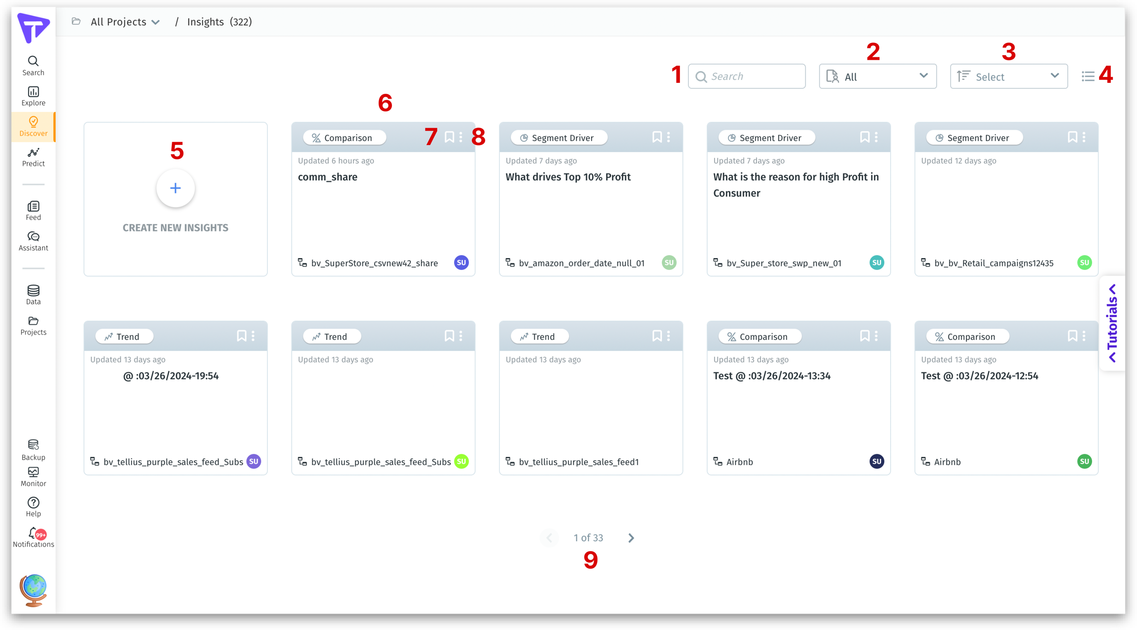 In Tellius, Insights can be accessed by clicking on the Discover tab on the left pane. All the existing Insights that were created by you or shared with you can be found here. Your journey with Insights begins with curiosity and leads to a deeper understanding of your business's data-driven narrative. Happy discovering! Let's break down the components of the following interface.