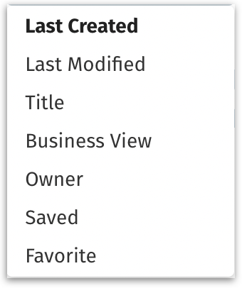 Select the order in which you want the Insights to be displayed. Sort by last created, last modified, title, Business View, Owner, Saved, and Favorite.