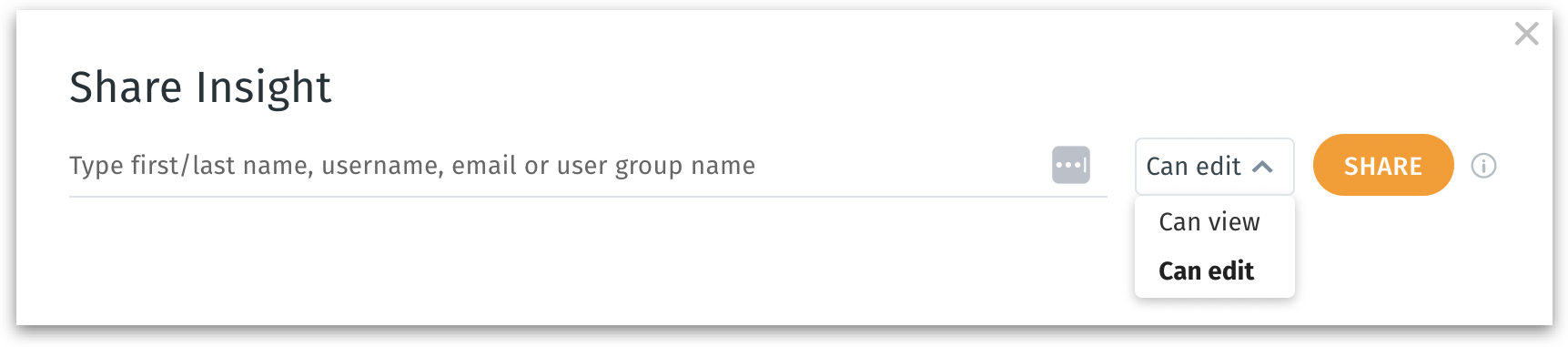 a. Share - To share the Insight with relevant permissions. The following window will be displayed where you can search for the required username, email, or user group, and provide view or edit permissions.