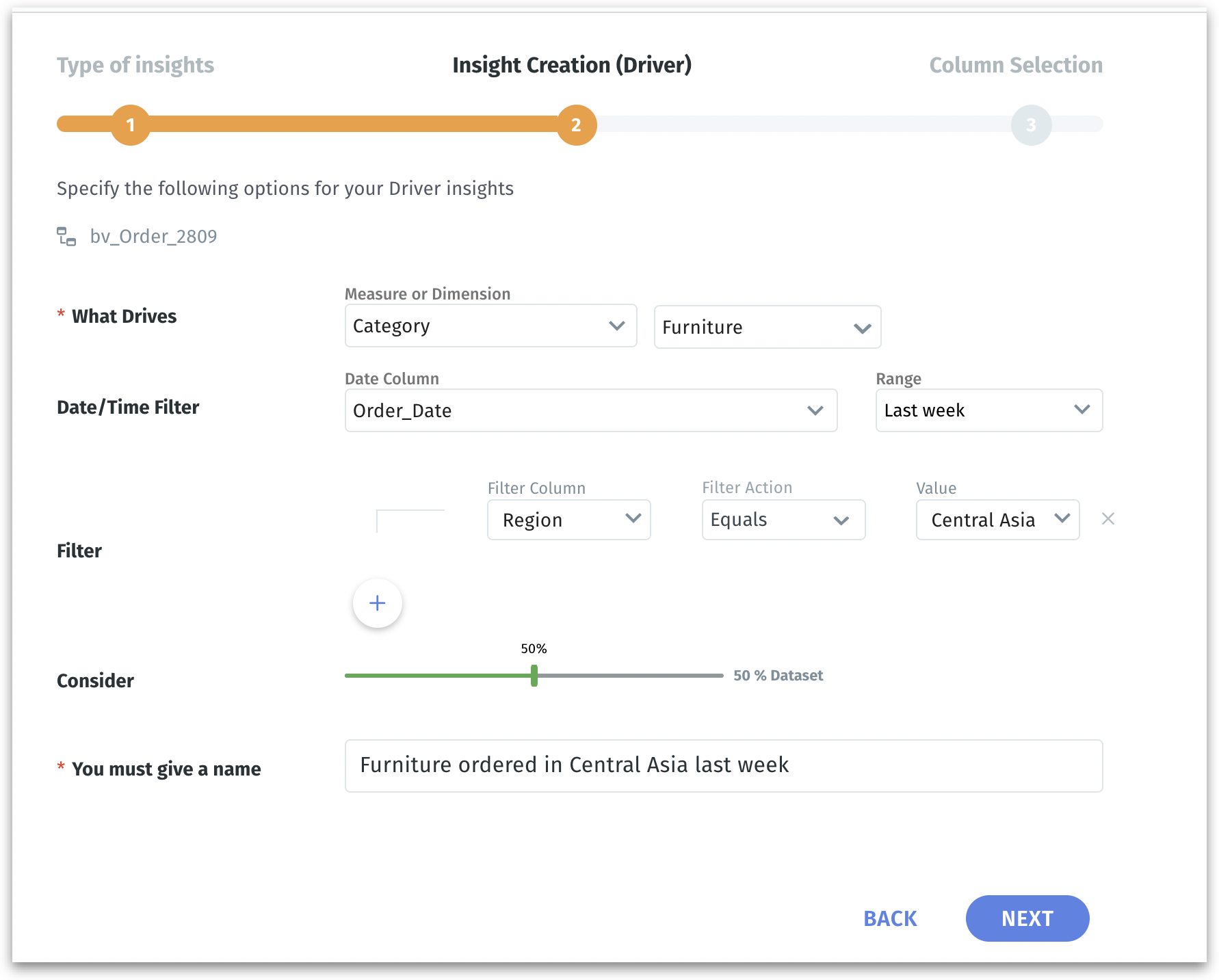 For the above configuration, the following screen will be displayed as the next step. Certain columns will be automatically excluded from the Insight generation.