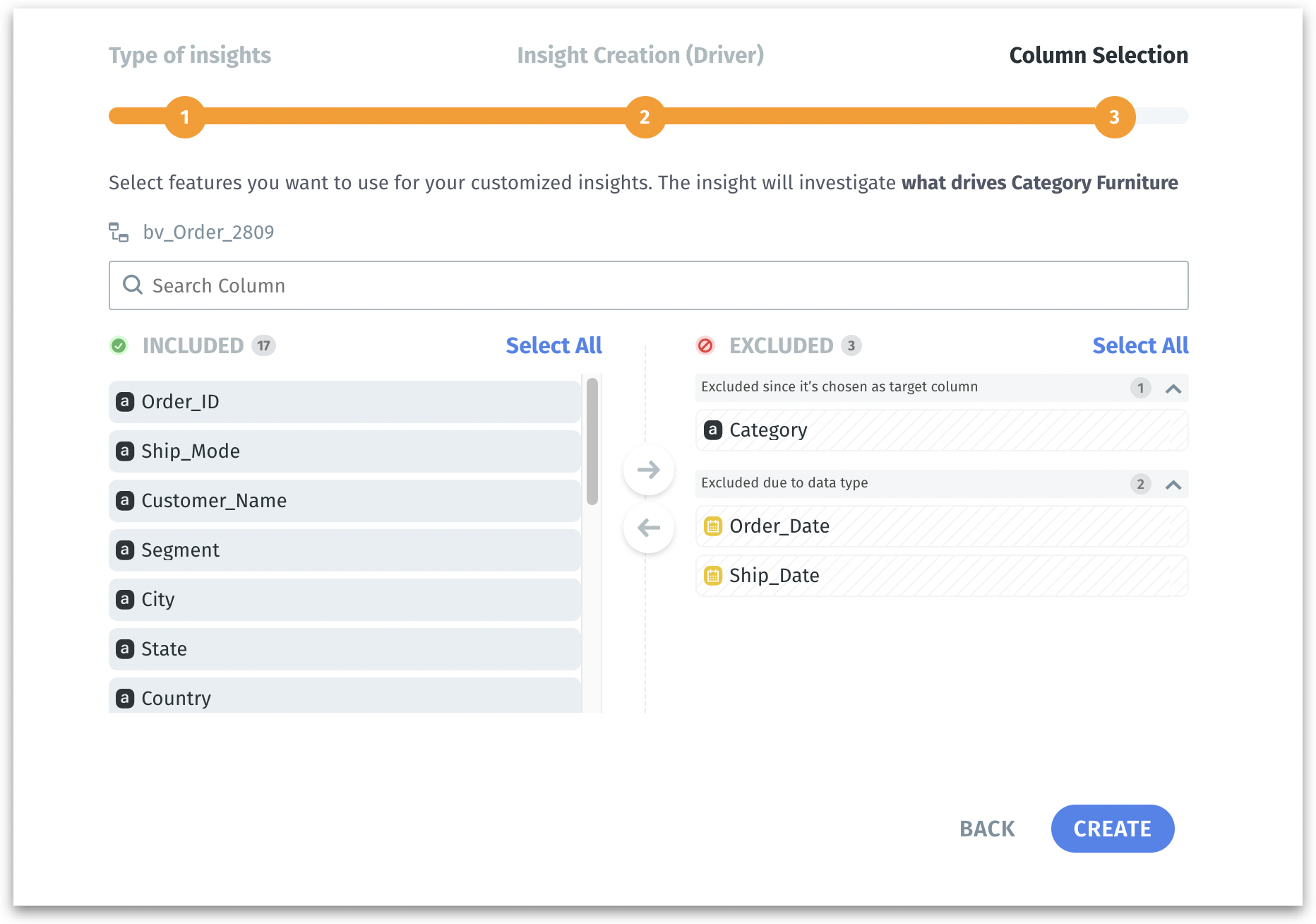 Deciding which columns to include or exclude should be strategic. In the above example, "Order_Date" and "Ship_Date" are excluded due to their data type (date), which could be unsuitable for the specific driver analysis.