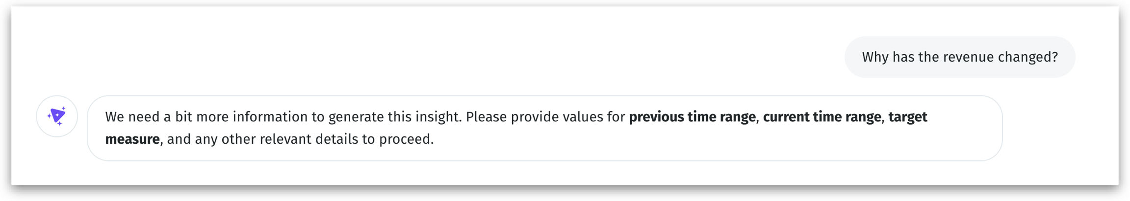If required inputs (like time ranges or target metrics) are missing, Kaiya will prompt you to provide: