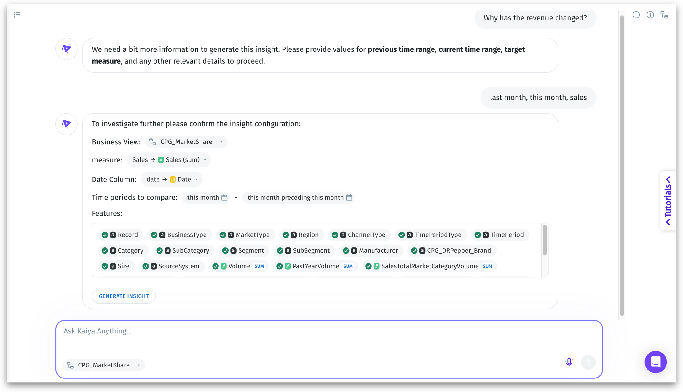 Kaiya supports automated insight generation via natural language "why" questions (e.g., “Why has revenue changed?”). When such a question is asked, Kaiya internally triggers the Insights Agent, configures a comparative analysis, and populates insight settings automatically—without requiring manual setup or pre-configuration in Composer.