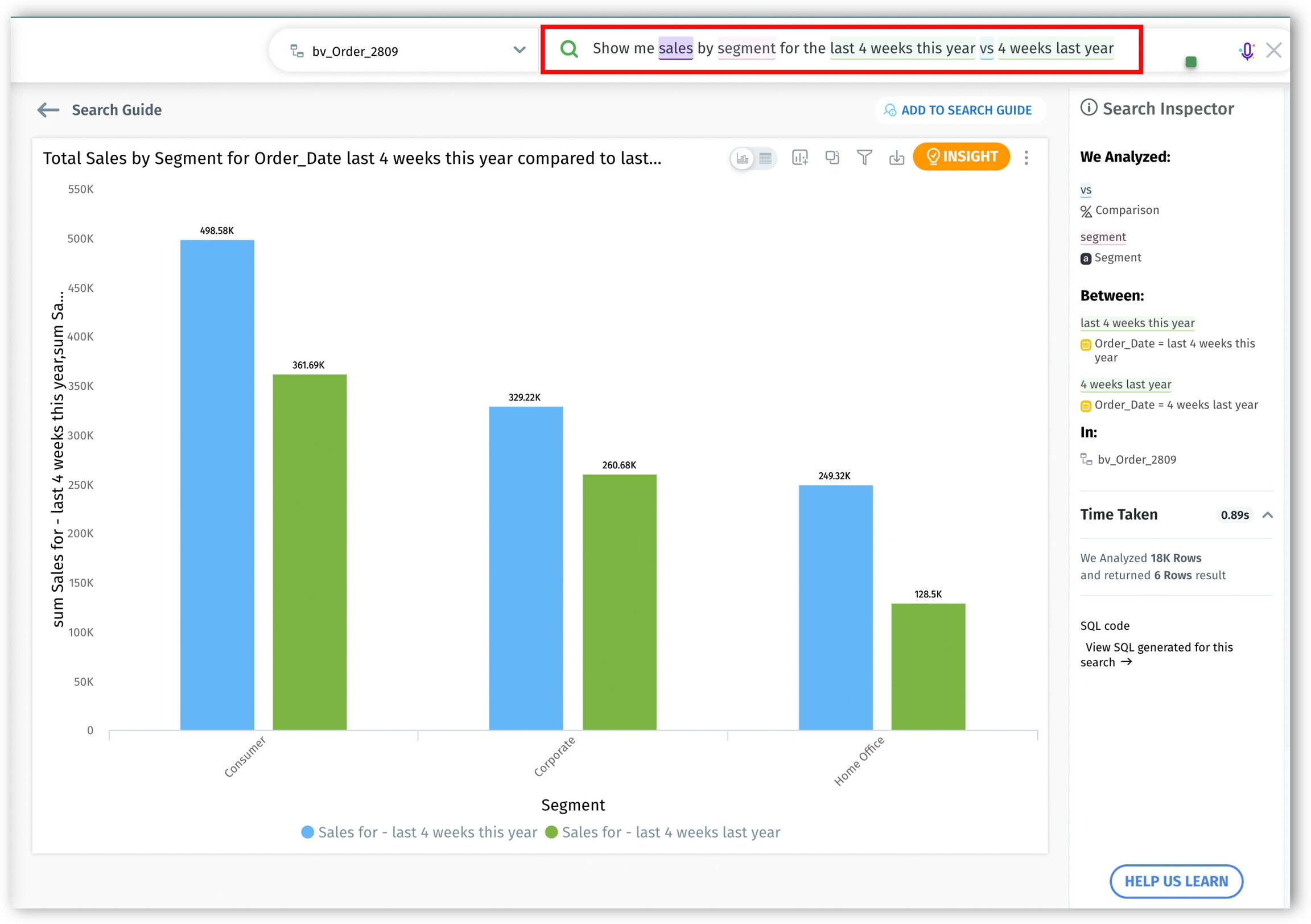 Show me sales by segment for the last x [days/weeks/months/quarters] this year [vs/compared to] x [days/weeks/months/quarters] last year