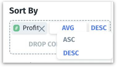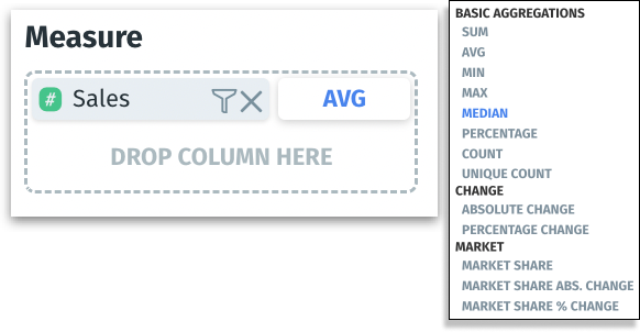 Measure columns display an aggregation label. Click on the label to explore the full range of available aggregation options to modify how the data needs to be summarized.