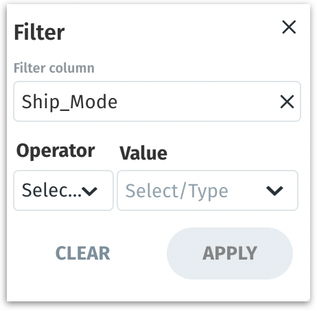Clear: Resets the filter configuration, removing any selected values and operators from the current filter setup.