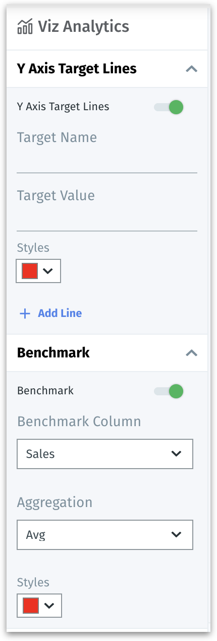 The "Advanced Analytics" (or "Viz Analytics") section provides additional data points and benchmarks that can provide deeper insights and context. Incorporating Y-axis target lines and Benchmarks in a chart makes it easier for users to measure performance, identify trends, and make data-driven decisions.