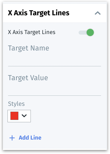 The "X-Axis Target Lines" allows users to add horizontal lines across the chart, which serve as benchmarks or goals for the data being visualized. X-axis target lines can be used for comparing actual data points against targets to assess performance and establish clear visual goals for future performance.