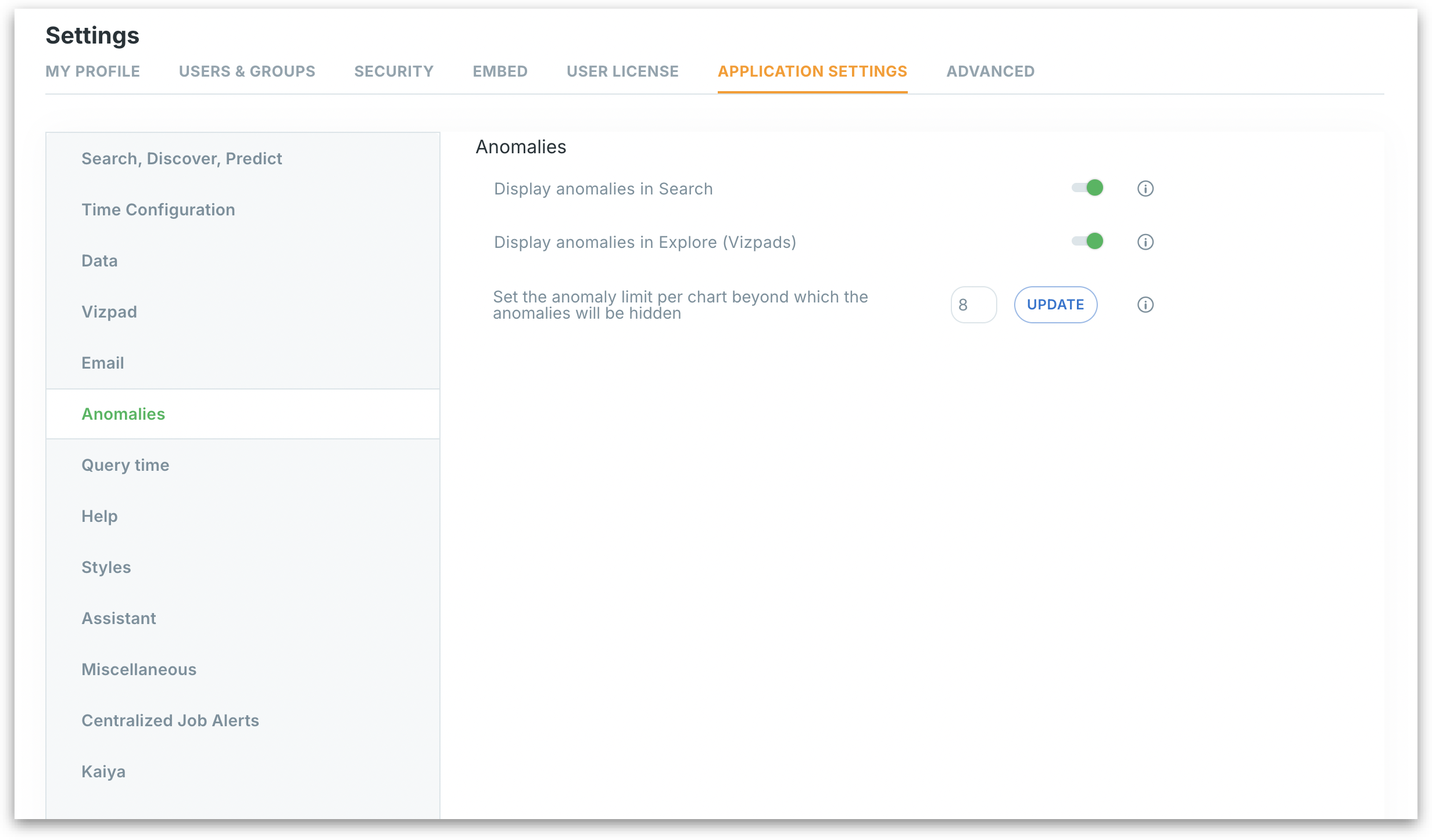 Under **Settings → Application Settings → Anomalies**, admins can fine-tune how anomaly detection is displayed across Tellius. Anomalies highlight data points that deviate significantly from expected patterns, helping users identify outliers, spikes, or dips in trends—whether during ad hoc searches or in Vizpads.
