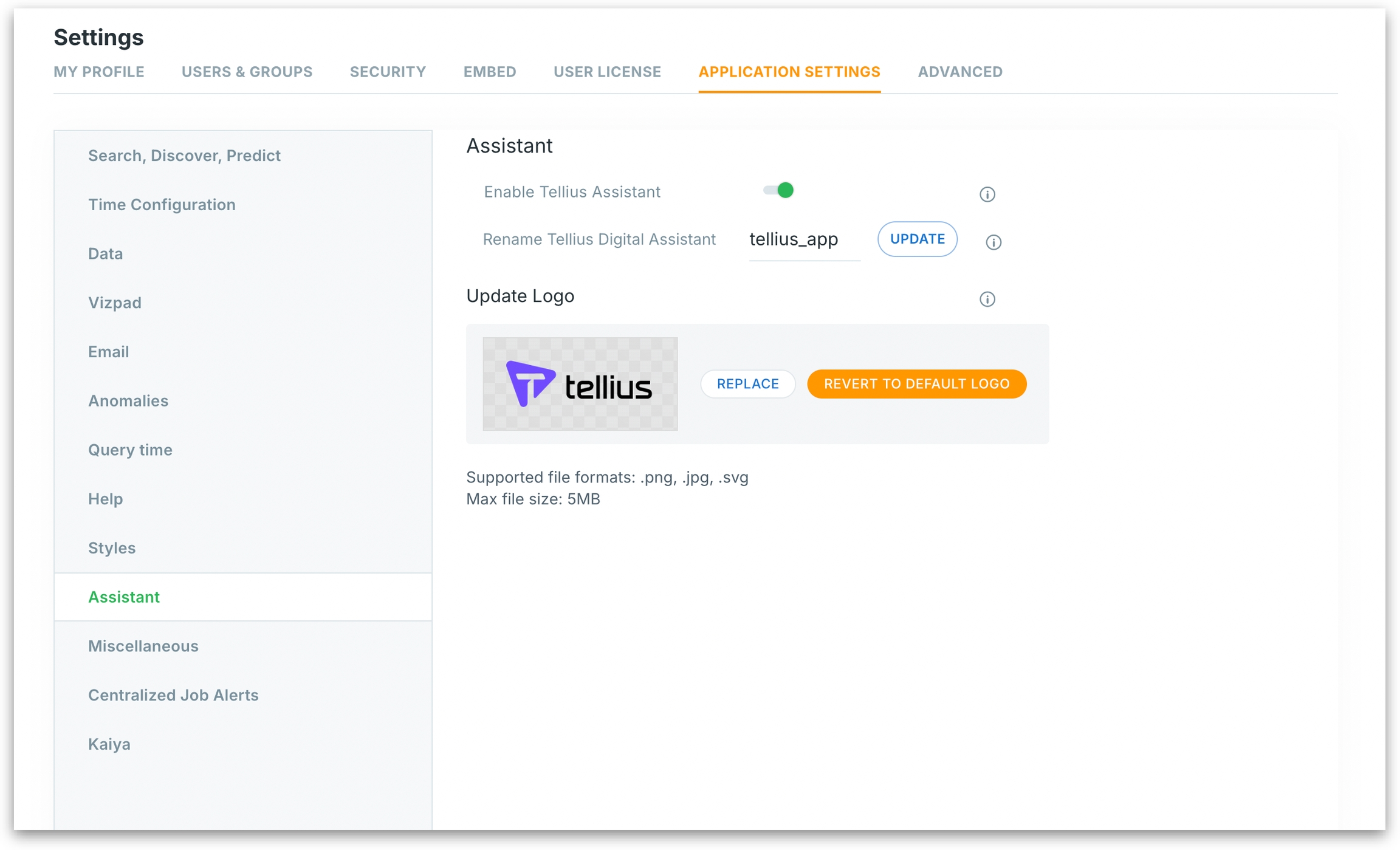 Under Settings → Application Settings → Assistant, admins can configure how Tellius Assistant appears and behaves across the application. This Assistant serves as an interactive conversational agent that helps users query data, explore insights, and receive recommendations using natural language.