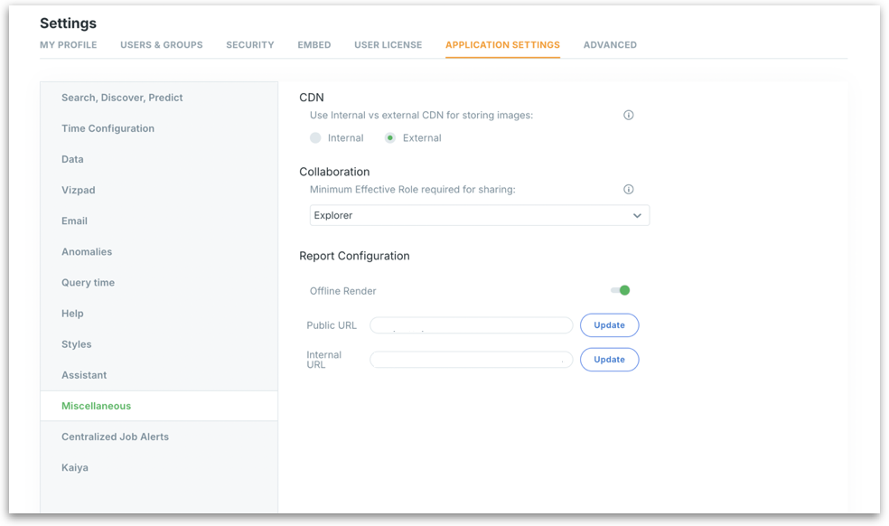 Public URL: The URL used by external users or services to access shared or rendered content from Tellius. Click on Update to apply changes.