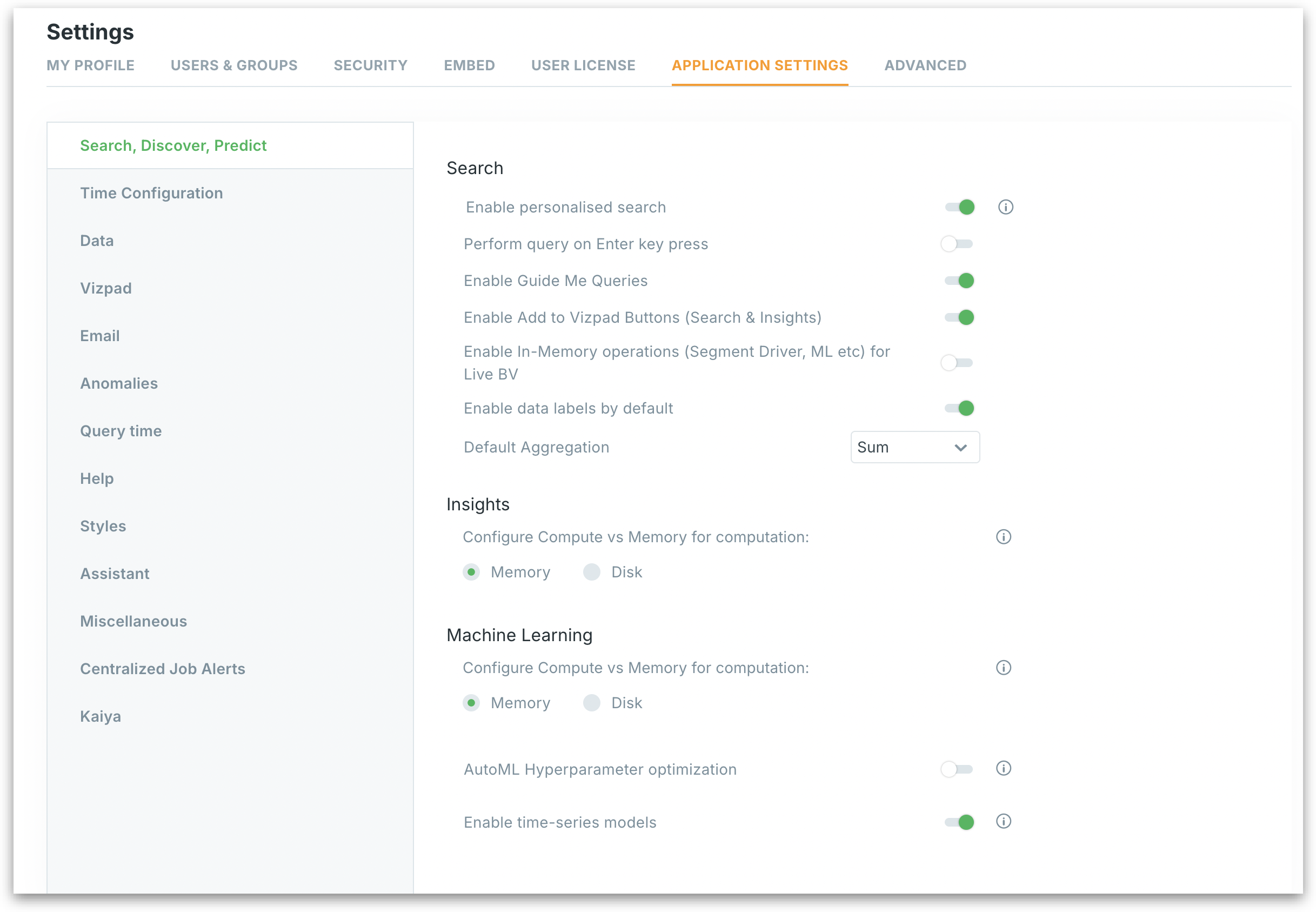 This section enables admins to fine-tune how users interact with Tellius's core search, insight generation, and machine learning capabilities.&#x20;