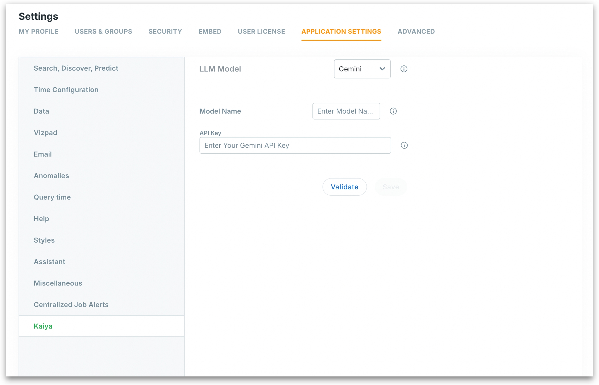 From Tellius 5.4, admins can configure which LLM (Large Language Model) Kaiya uses to interpret questions, generate insights, and trigger workflows. This is managed under Settings → Application Settings → Kaiya.