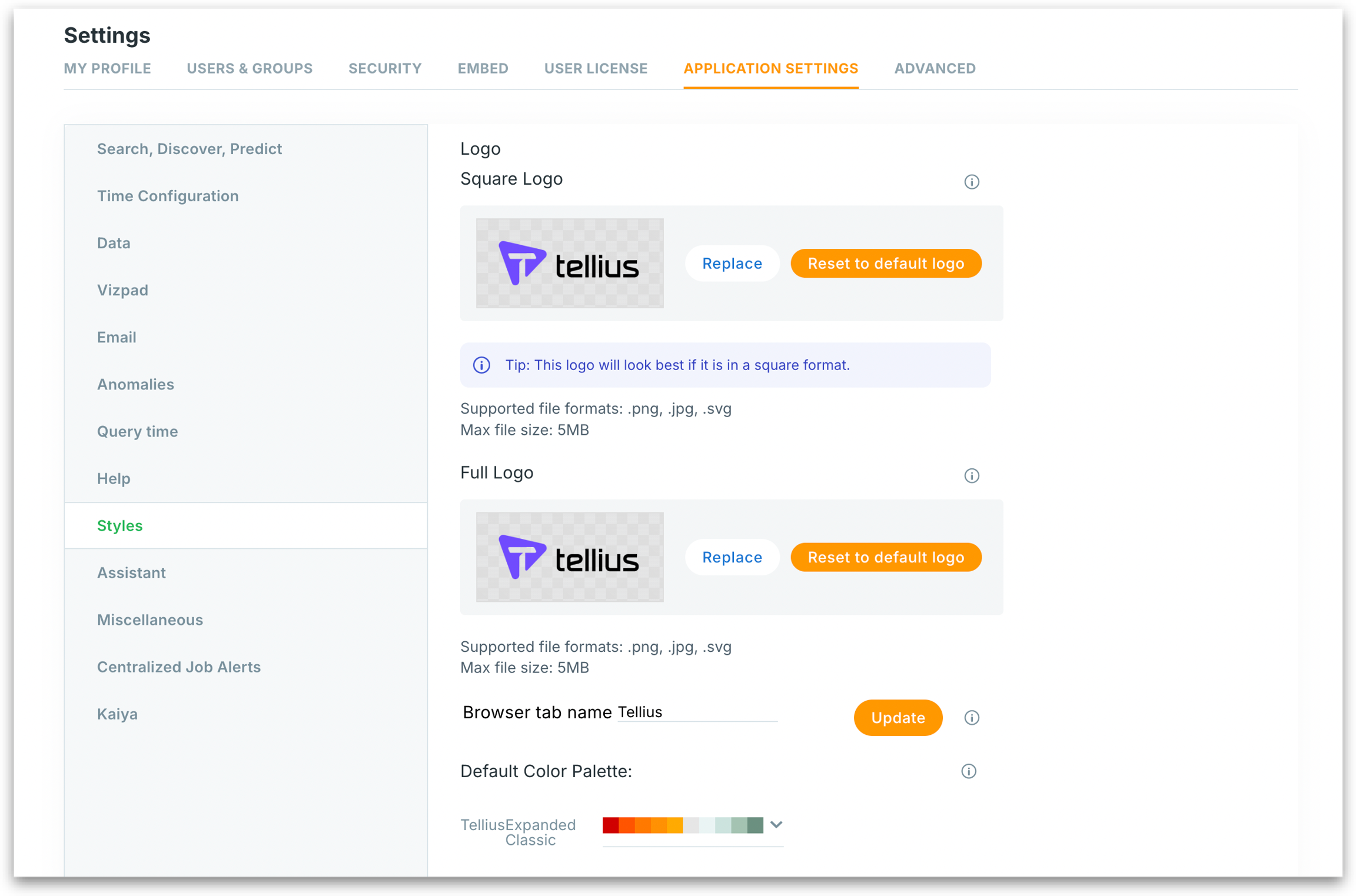 Under Settings → Application Settings → Styles, admins can personalize Tellius environment to reflect their organization's brand identity.