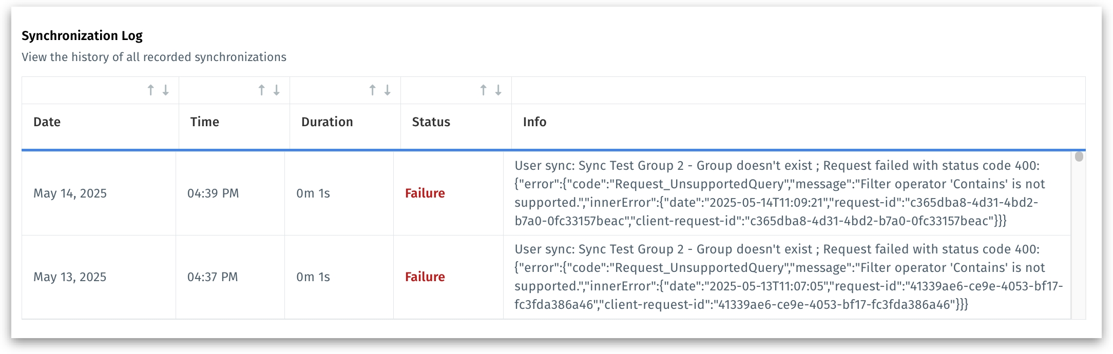 Info: A detailed log message explaining the sync operation and any errors encountered, including system-generated error codes and descriptions