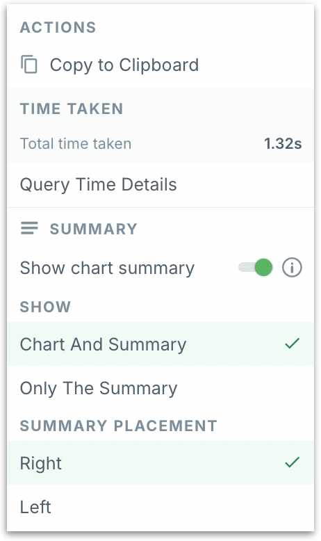 Total time taken: It displays the time taken by Tellius and other external engines to load the individual chart. Click on Query time details to view the complete breakdown.
