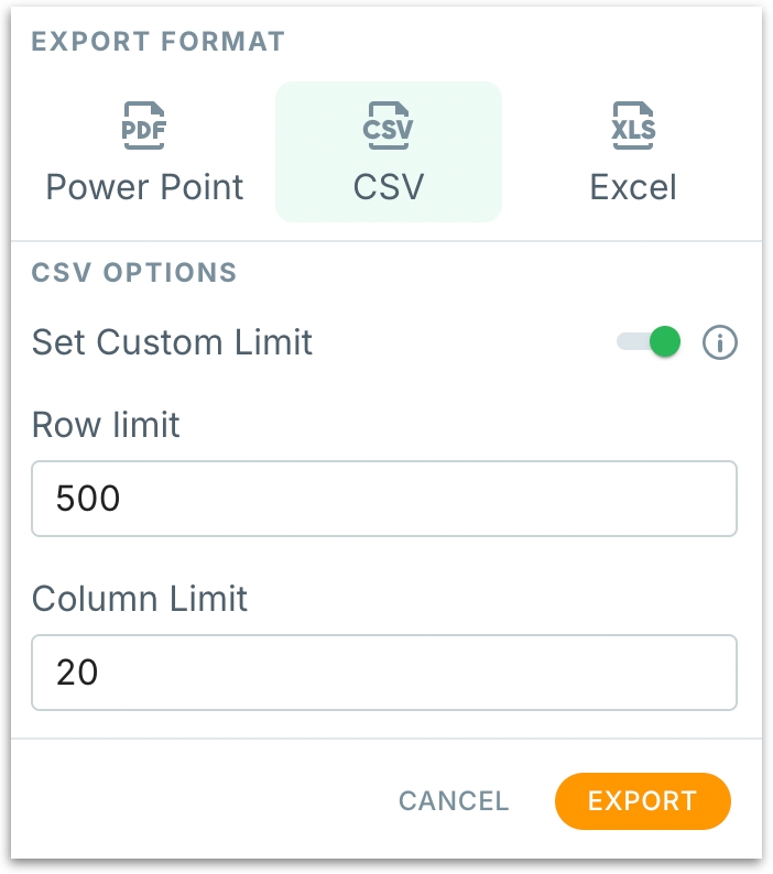 Select Export, and select your desired format: CSV, Excel, or PowerPoint.