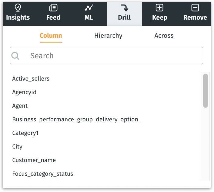 Drilling offers a granular view by changing the chart’s focus or applying the insight to other contexts. Drilling can be done by columns, hierarchy, or across Vizpads.