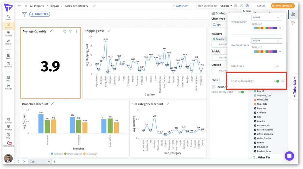 Configuring the display of anomalies to be effective across a Vizpad tab
