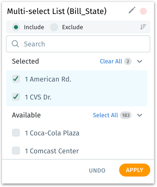 Exclude list displays the list of excluded values. In that case, the values under Selected are the ones that will not be considered for filters.