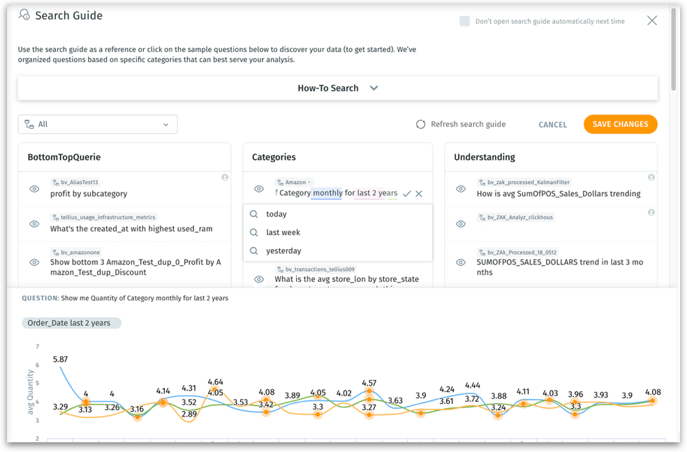 The Search Guide can now be customized to include relevant questions tailored to each Business View. Admins can edit entire search queries (including categories), distinguish between user-updated and auto-generated queries, and get suitable suggestions for the query being typed. Moreover, we have increased the number of queries per category from three to five and added the ability to hide or unhide queries. A dedicated section has been included for real-time query result previews, enabling admins to accept or discard queries based on the preview. The Search Guide is now personalized and informative, transforming the user experience and simplifying the onboarding process.