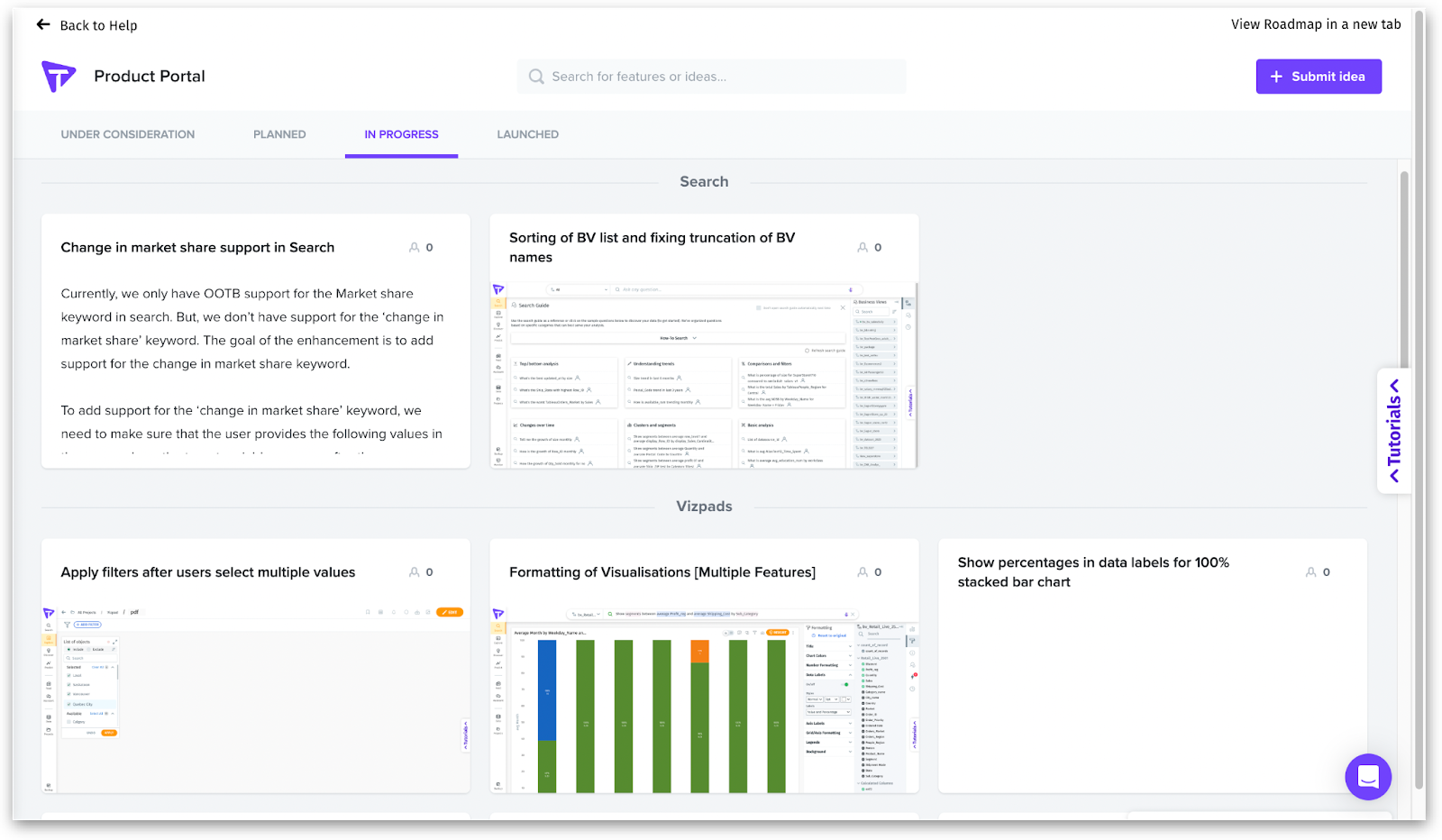 Now, customers have the opportunity to submit ideas, view submissions from other users, and provide feedback on our planned features. The product updates can be found under Help → Tellius Product Roadmap. They are organized into four categories: Under Consideration, Planned, In-Progress, and Launched, offering a clear overview of our development progress. Customers can influence the roadmap by rating or voting on features. As a feature receives more votes, it climbs higher on the list, gaining increased visibility and consideration. This enhancement aims to foster greater collaboration between our product team and customers, allowing us to continuously improve Tellius based on valuable feedback and insights.