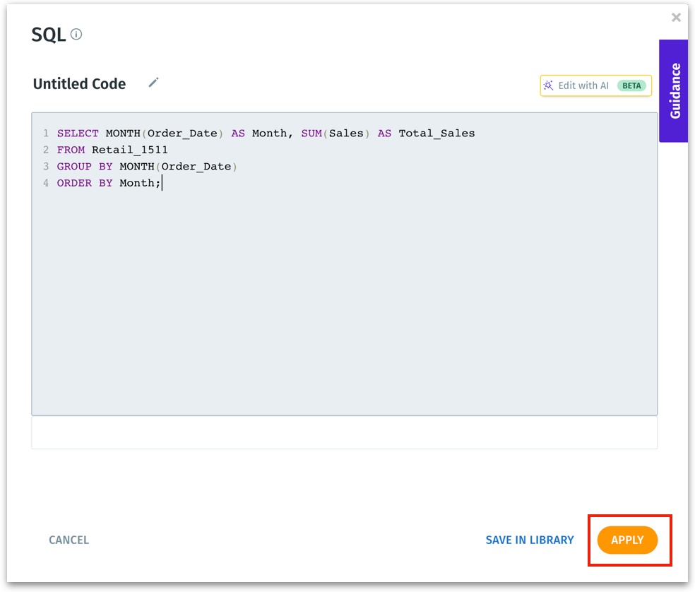 While creating or editing Python/SQL code, Tellius now provides the option to apply the code directly to the dataset without saving it to the code library first—thus accelerating time to insights.