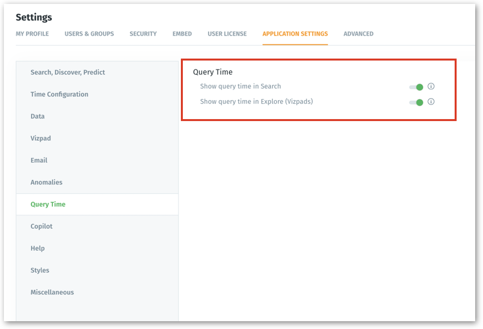Admins can now enable/disable the display of query time inspector for Search and Vizpads. Under Settings → Application Settings, admins can choose whether they want to display the time taken to execute every search query.