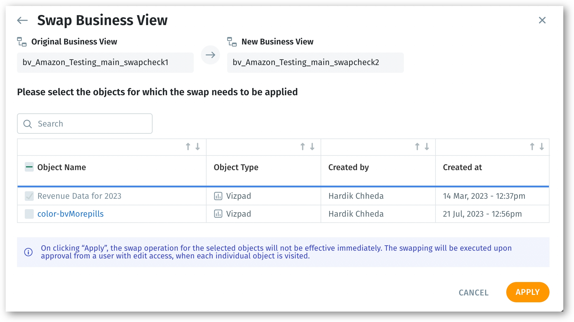 While swapping the underlying Business View of any object, users can simultaneously select multiple objects (Vizpads/Insights/Models) for which the Business Views need to be swapped. The swapping operation of the selected objects can be set up and will be effective once it is approved by a user with edit access.