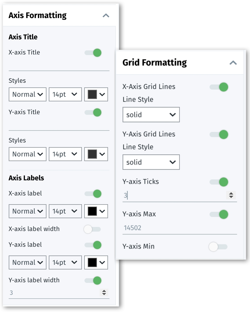 Axis formatting and grid formatting have been incorporated into bar conversion charts. Additionally, grid formatting has been extended to histogram and confidence range charts.