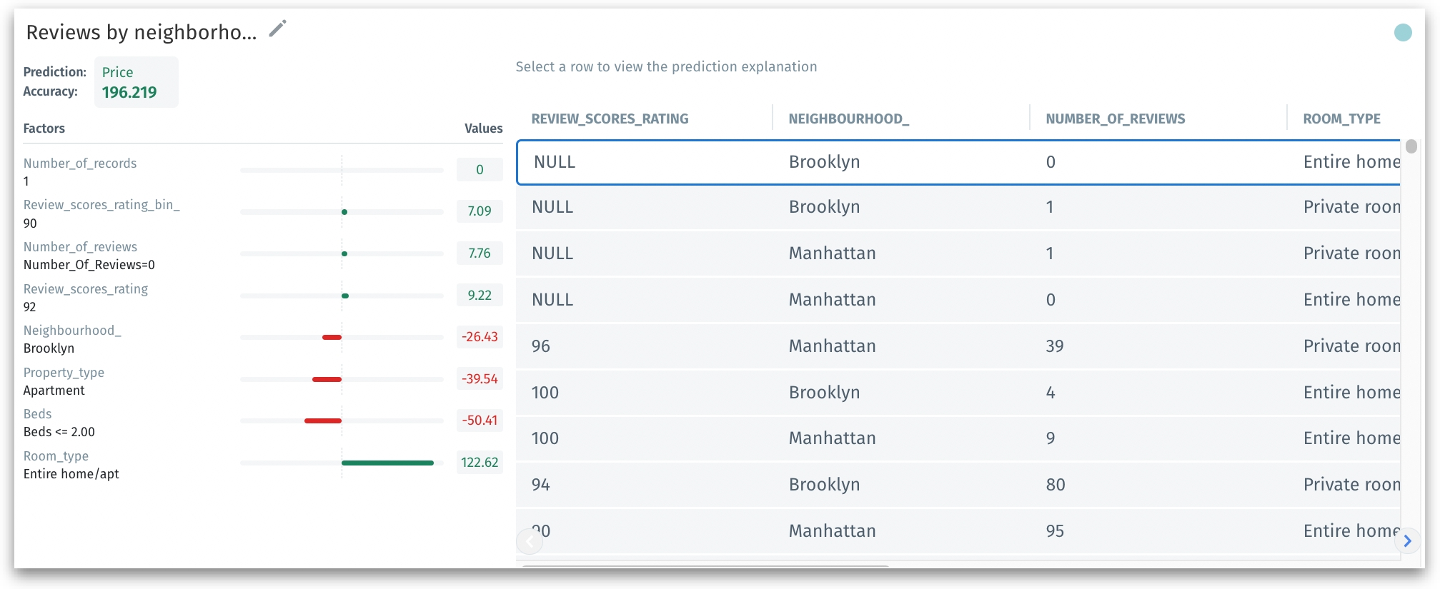In Vizpads, we have introduced explainable AI charts that allow users to easily visualize and understand the factors influencing their machine learning model's predictions. It offers insights into the underlying reasons behind each prediction, ensuring users can make more informed decisions and better mitigate potential risks. This chart is composed of two essential sections: a table displaying all columns in the Business View with an option to select specific rows, and a detailed breakdown of the factors influencing the predicted value for the chosen row.